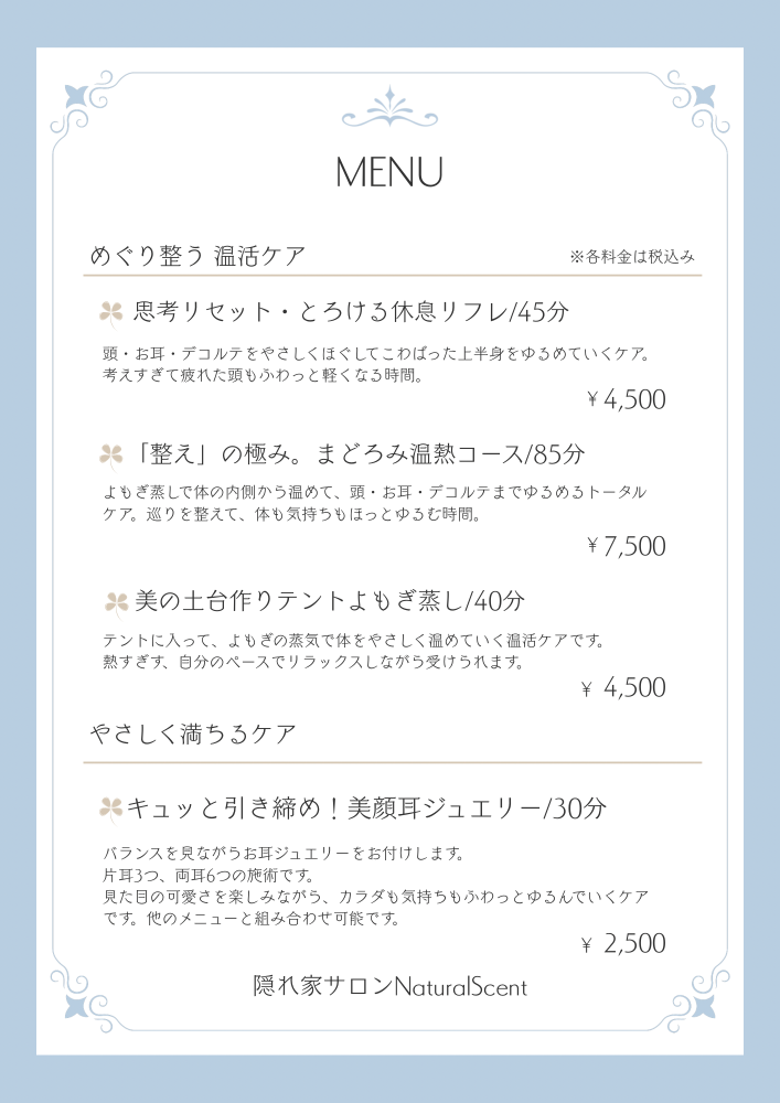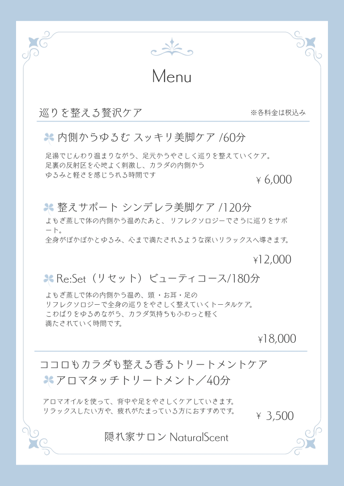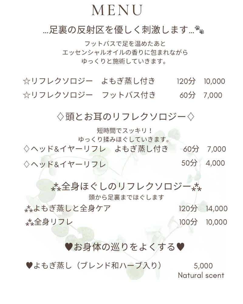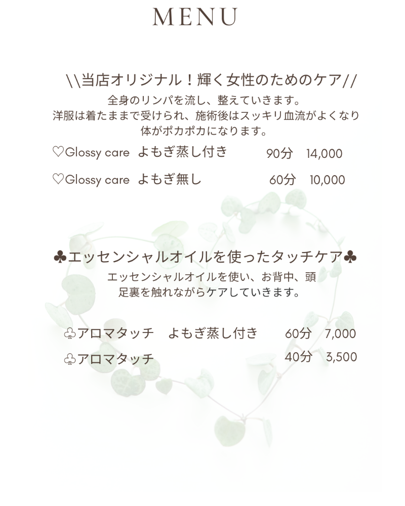 リラクゼーションを目的とした施術を行っております。医療行為、それに準ずる施術は行っておりませんのでご了承ください。